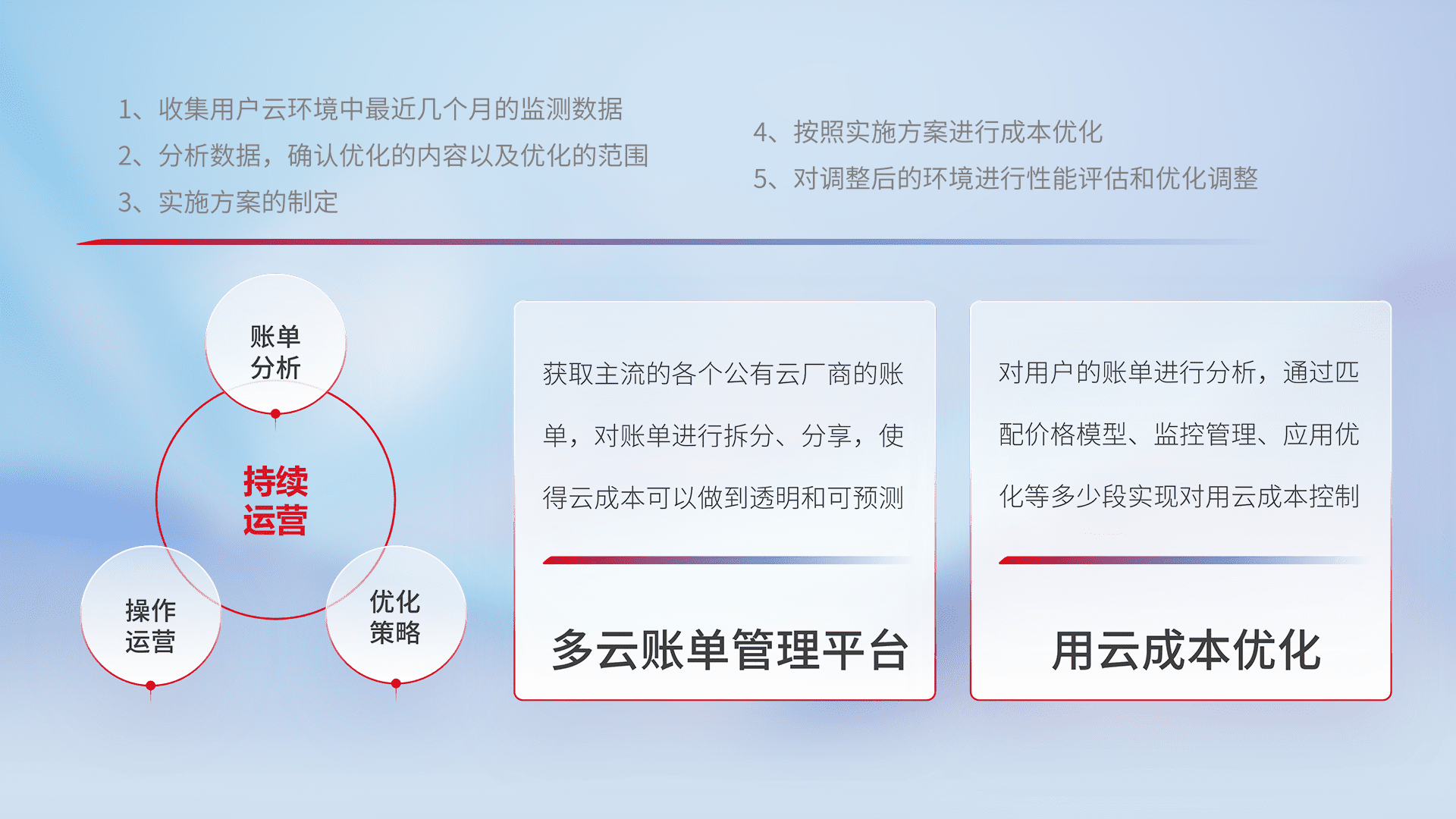 通过多云纳管,,以统一的资源数据模型把客户的云资源进行抽象和封装,,,,进而实现对多云资源的统一操作,,,,保障云资源管理的可靠性、、稳定性与可用性。。。量身定制化运维内容,,配置、、开发运维、、、、补丁管理、、、、备份、、监控、、认证和访问管理、、审计和日常巡检等,,,保障在用云过程中的可靠度,,,稳定度以及高可用率。。。